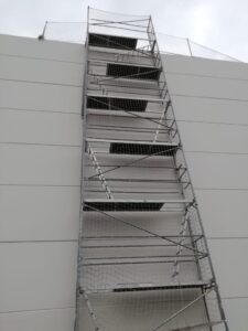 Alquiler y montaje de andamios de acceso a cubiertas cumpliendo con RD 2177/04 que modifica el RD1215/97 de disposiciones mínimas de los equipos de trabajo y con Norma UNE-EN–12810-1:2005.